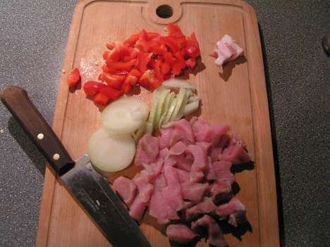 Ингредиенты нарежьте. Поскольку мяса у меня совсем немного, я использую стратегическую хитрость: чем меньше продукта, тем мельче его надо резать. Необъяснимо, но факт: создается некая видимость изобилия. Свинину режьте кубиками или полосками, лук - кольцами или полукольцами, перец - как заблагорассудится. Но не очень крупно.