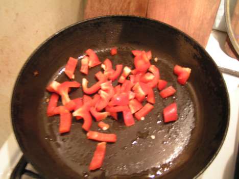 Когда лук станет золотистым, положите его к мясу и перемешайте. Пусть потушатся вместе, а вы тем временем на той же сковородке обжарьте сладкий перец. И его туда же, в сотейник, к мясу и луку. Теперь потушите блюдо еще минут десять и аккуратно - не обожгитесь! - попробуйте. В принципе, должно уже быть готово, но если нет - потушите еще.