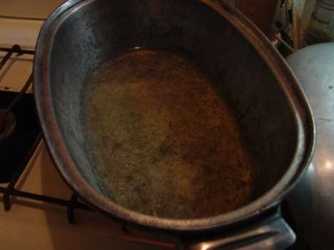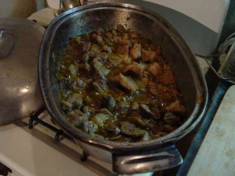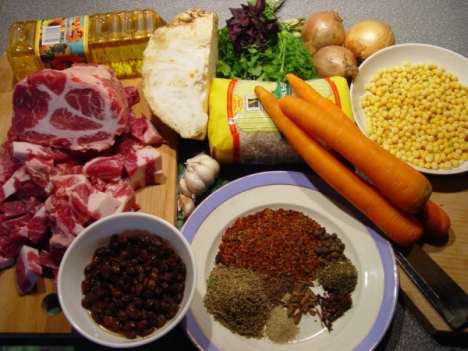Итак, сегодня нам понадобятся: большой чугунный казан (или, в крайнем случае, чугунная гусятница, как у меня), килограмм мяса (вообще говоря, идеальна будет мякоть бараньей ноги, но почему бы не взять, как я сейчас, свиную шею?), граммов шестьсот рису (на худой конец, "золотистого" или "краснодарского", но уж никак не сечки), полтора стакана растительного масла (лучше всего - рафинированного подсолнечного, в идеале - хлопкового, но ни в коем случае не оливкового), головки три-четыре репчатого лука, две-три моркови, две трети стакана изюма, полстакана гороха, пара головок чеснока… и, конечно, пряности.