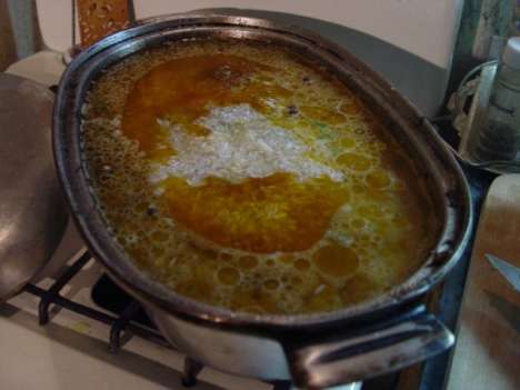 Перед самым началом лично я быстро обжариваю в масле десяток гвоздичин - для появления характерного аромата у масла. Если хотите последовать моему примеру - опасайтесь пережечь гвоздику, она моментально пригорает. В разогретое масло опустите нарезанное мясо и обжарьте его до золотистой корочки. Опускайте мясо небольшими порциями, буквально по кусочку, непрерывно помешивая - если сделать это быстро, мясо охладит масло, даст сок и будет не жариться, как нам требуется, а тушиться. Когда на мясе появится корочка, выньте его шумовкой из казана и обжарьте в казане лук и морковь (до золотистого цвета у лука), после чего верните в казан и мясо. Почти все, за исключением пары кусочков - они понадобятся нам, чтобы закусить, ибо настало время для второй рюмки водки. Когда полностью испарится мясной сок, еще раз размешайте мясо с луком и морковью, добавьте пару стаканов воды, соль, оставшиеся пряности и оставьте получившийся зирвак кипеть еще минут двадцать-тридцать. Соли должно быть столько, чтобы зирвак казался пересоленным - после добавления риса ее окажется в самый раз.