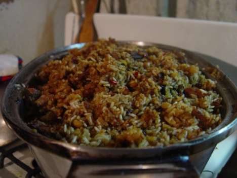 Теперь наступает самый ответственный момент - закладка риса. Перед этим в середину казана мы опустим головку чеснока (целиком, не очищая), горох и изюм. Ни чеснок, ни горох, ни изюм не должны касаться горячих стенок казана, иначе пригорят. Засыпая рис, мы распределяем его равномерно по всему казану так, чтобы он прикрывал мясо и все остальное как бы "крышкой". Ни в коем случае не перемешивайте! Когда рис окажется в казане, осторожно, по краям казана, не нарушая целостности слоя риса, долейте воды так, чтобы она закрывала рис на палец, и оставьте плов вариться. Самое время выпить третью рюмку водки.